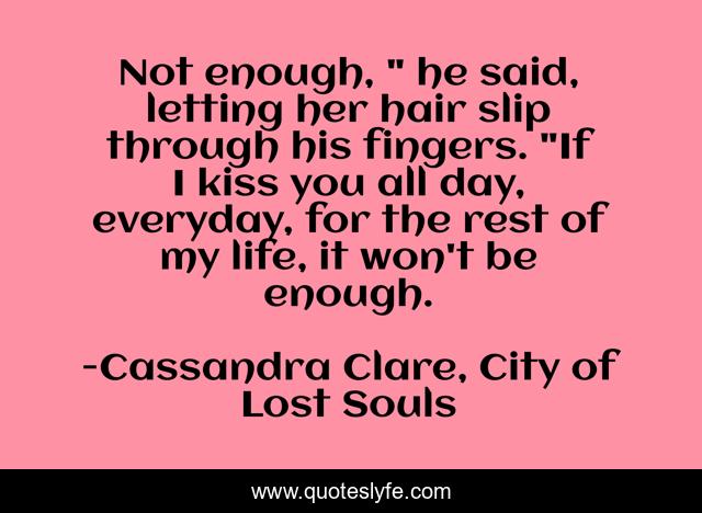 This page presents the quote "Not enough, " he said, letting her hair slip through his fingers. "If I kiss you all day, everyday, for the rest of my life, it won't be enough.". Author of this quote is Cassandra Clare, City of Lost Souls. This quote is about kissing, clary-fray, jace, love, affection,.
