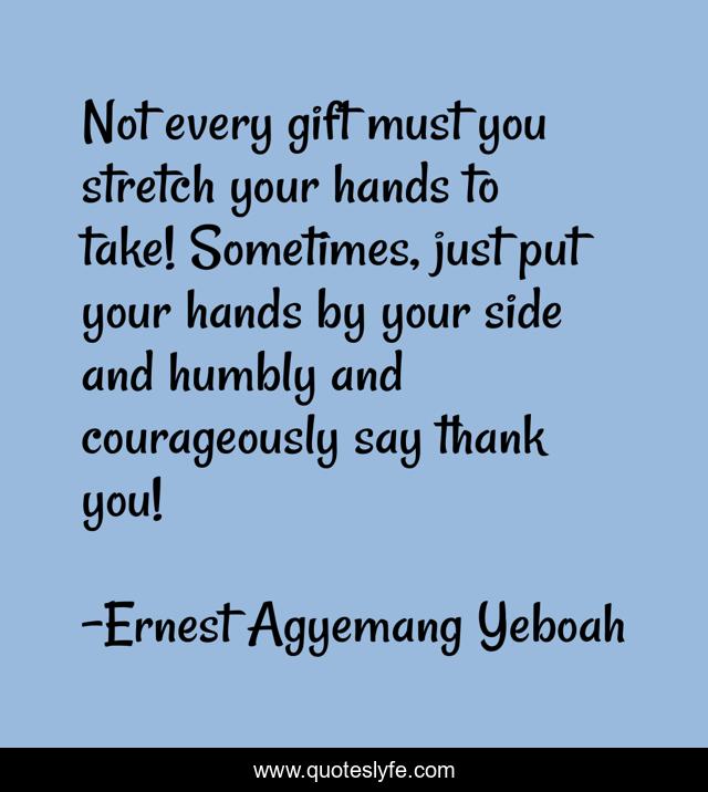 This page presents the quote "Not every gift must you stretch your hands to take! Sometimes, just put your hands by your side and humbly and courageously say thank you!". Author of this quote is Ernest Agyemang Yeboah. This quote is about business, courage-to-say-no, gifts, bribery, leadership, integrity, corruption,.