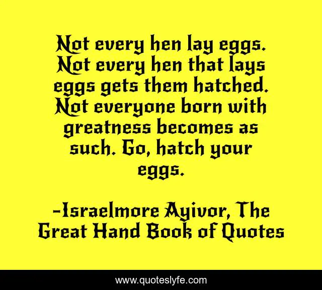 This page presents the quote "Not every hen lay eggs. Not every hen that lays eggs gets them hatched. Not everyone born with greatness becomes as such. Go, hatch your eggs.". Author of this quote is Israelmore Ayivor, The Great Hand Book of Quotes. This quote is about born-great, fowl, win, born, legacy, birds, make-an-impact, impact, food-for-thought,.