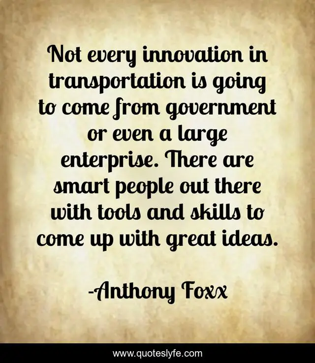 This page presents the quote "Not every innovation in transportation is going to come from government or even a large enterprise. There are smart people out there with tools and skills to come up with great ideas.". Author of this quote is Anthony Foxx. This quote is about innovation, government,.