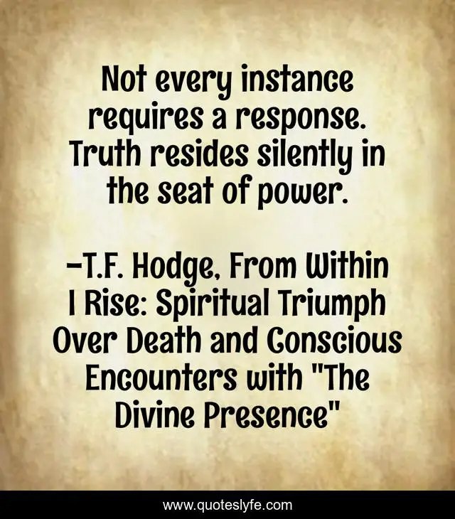 This page presents the quote "Not every instance requires a response. Truth resides silently in the seat of power.". Author of this quote is T.F. Hodge, From Within I Rise: Spiritual Triumph Over Death and Conscious Encounters with "The Divine Presence". This quote is about power, communication, quotes, truth, response, silence,.