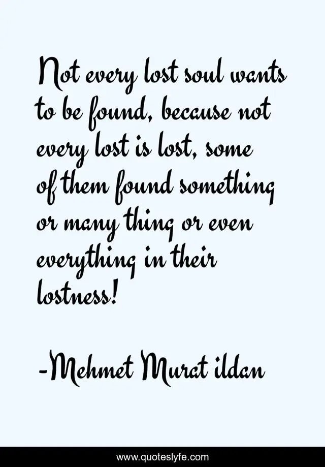 This page presents the quote "Not every lost soul wants to be found, because not every lost is lost, some of them found something or many thing or even everything in their lostness!". Author of this quote is Mehmet Murat ildan. This quote is about found, mehmet-murat-ildan, ildan-wise-sayings, turkish, ildan-wisdom, turkish-playwrights, turkish-wisdom-words, lost-souls, turkish-writers,.