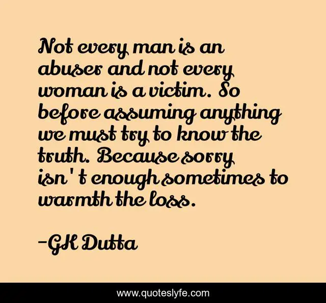 This page presents the quote "Not every man is an abuser and not every woman is a victim. So before assuming anything we must try to know the truth. Because sorry isn't enough sometimes to warmth the loss.". Author of this quote is GK Dutta. This quote is about love, women-and-men, relationship, affection,.
