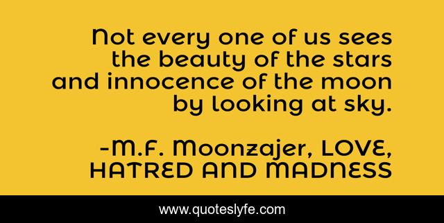 This page presents the quote "Not every one of us sees the beauty of the stars and innocence of the moon by looking at sky.". Author of this quote is M.F. Moonzajer, LOVE, HATRED AND MADNESS. This quote is about innocence, sky, beauty, stars, moon,.