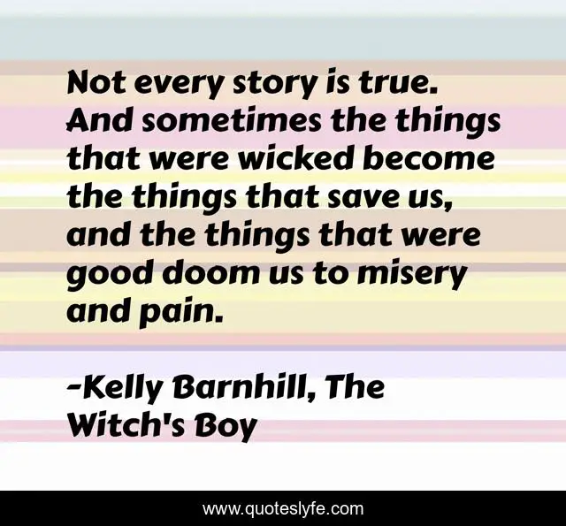 This page presents the quote "Not every story is true. And sometimes the things that were wicked become the things that save us, and the things that were good doom us to misery and pain.". Author of this quote is Kelly Barnhill, The Witch's Boy. This quote is about good, stories, evil,.