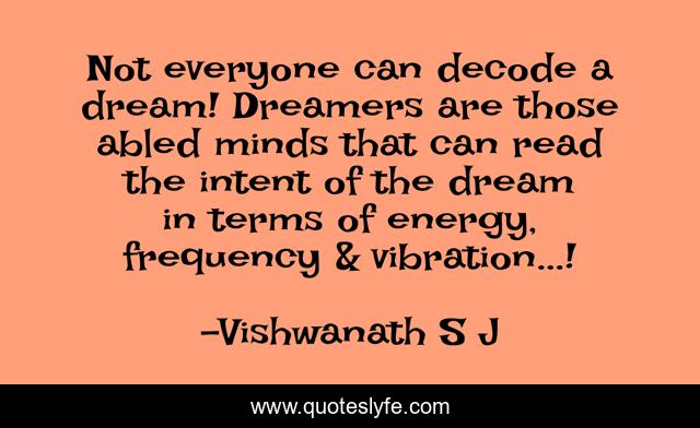 This page presents the quote "Not everyone can decode a dream! Dreamers are those abled minds that can read the intent of the dream in terms of energy, frequency & vibration...!". Author of this quote is Vishwanath S J. This quote is about universe-knowing-oneself, success, ufo, afterlife, aliens, time-travel, mind, vibrations, energy,.