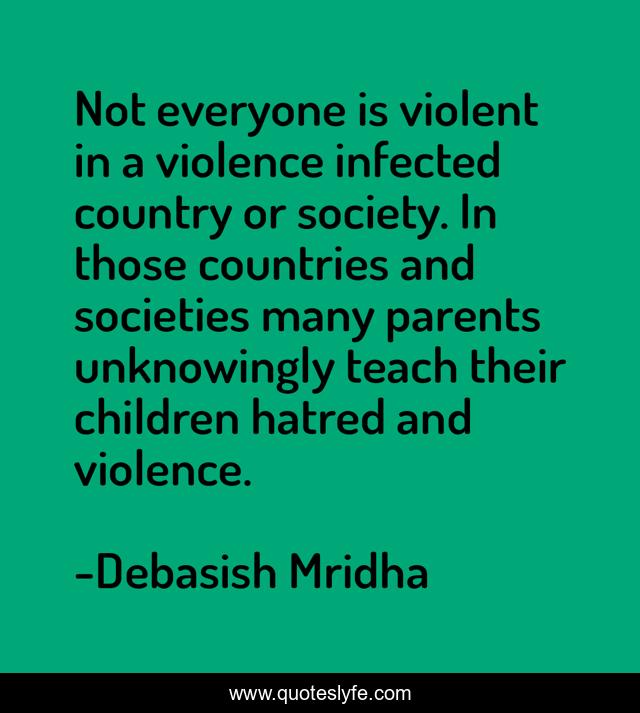 This page presents the quote "Not everyone is violent in a violence infected country or society. In those countries and societies many parents unknowingly teach their children hatred and violence.". Author of this quote is Debasish Mridha. This quote is about miraboli, philosophy, what-makes-people-violent, oscar-wilde, teach-children, debasish-mridha, tagore, quotes, buddha,.