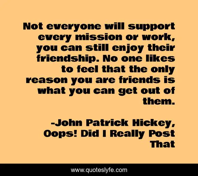 This page presents the quote "Not everyone will support every mission or work, you can still enjoy their friendship. No one likes to feel that the only reason you are friends is what you can get out of them.". Author of this quote is John Patrick Hickey, Oops! Did I Really Post That. This quote is about etiquette, social-media, success, civility, manners, personal-development, kindness,.