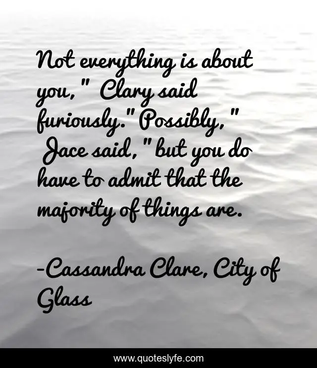 This page presents the quote "Not everything is about you, " Clary said furiously."Possibly, " Jace said, "but you do have to admit that the majority of things are.". Author of this quote is Cassandra Clare, City of Glass. This quote is about clary-fray, ego, jace-wayland,.