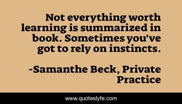 This page presents the quote "Not everything worth learning is summarized in book. Sometimes you've got to rely on instincts.". Author of this quote is Samanthe Beck, Private Practice. This quote is about brazen, contemporary-romance, life-lessons,.