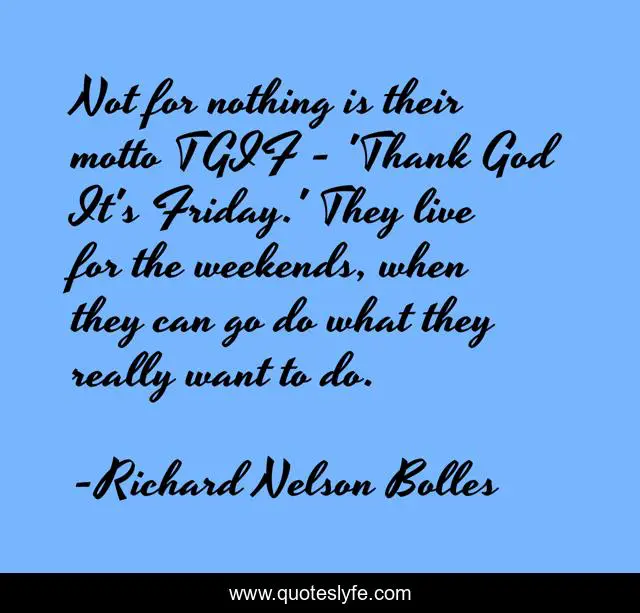 This page presents the quote "Not for nothing is their motto TGIF - 'Thank God It's Friday.' They live for the weekends, when they can go do what they really want to do.". Author of this quote is Richard Nelson Bolles. This quote is about god, motto, thank god,.