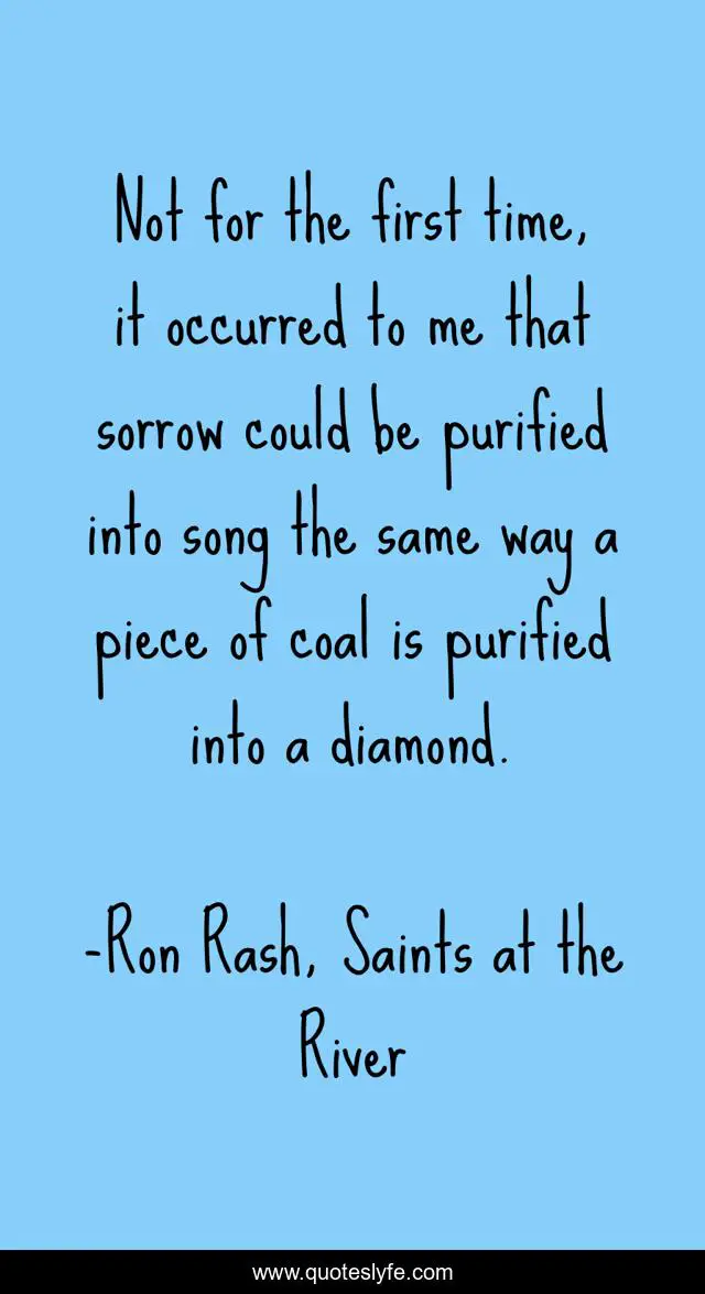 This page presents the quote "Not for the first time, it occurred to me that sorrow could be purified into song the same way a piece of coal is purified into a diamond.". Author of this quote is Ron Rash, Saints at the River. This quote is about music, sorrow, pain,.