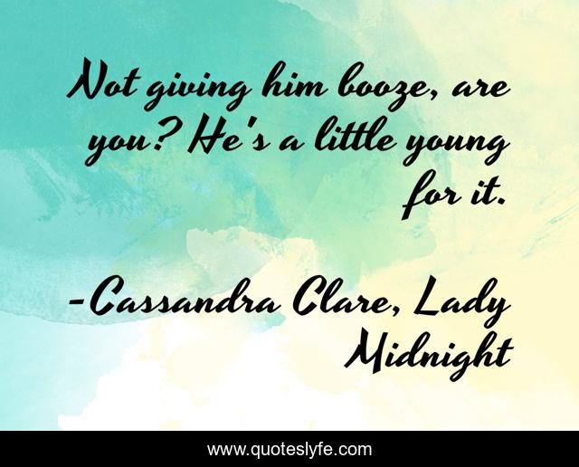 This page presents the quote "Not giving him booze, are you? He's a little young for it.". Author of this quote is Cassandra Clare, Lady Midnight. This quote is about flask, emma-carstairs, underage, alcohol,.