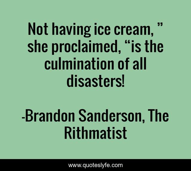 This page presents the quote "Not having ice cream, ” she proclaimed, “is the culmination of all disasters!". Author of this quote is Brandon Sanderson, The Rithmatist. This quote is about ice-cream, disaster, tragedy,.