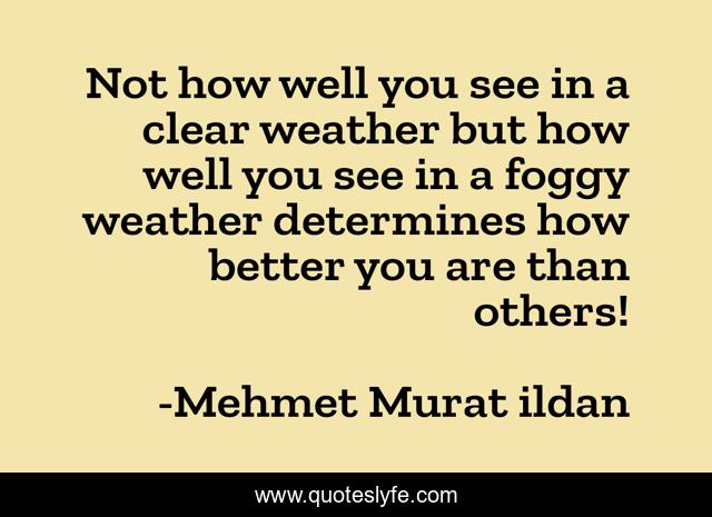 This page presents the quote "Not how well you see in a clear weather but how well you see in a foggy weather determines how better you are than others!". Author of this quote is Mehmet Murat ildan. This quote is about mehmet-murat-ildan, turkish, better-than-others, clear-view, foggy-weather, turkish-writers, turkish-literature, foggy, clear-vision,.