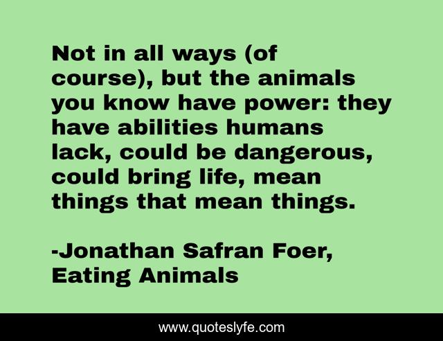 This page presents the quote "Not in all ways (of course), but the animals you know have power: they have abilities humans lack, could be dangerous, could bring life, mean things that mean things.". Author of this quote is Jonathan Safran Foer, Eating Animals. This quote is about animals, poetry, nature,.