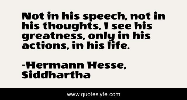 This page presents the quote "Not in his speech, not in his thoughts, I see his greatness, only in his actions, in his life.". Author of this quote is Hermann Hesse, Siddhartha. This quote is about action, thought, life, speech,.