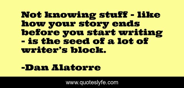 This page presents the quote "Not knowing stuff - like how your story ends before you start writing - is the seed of a lot of writer’s block.". Author of this quote is Dan Alatorre. .