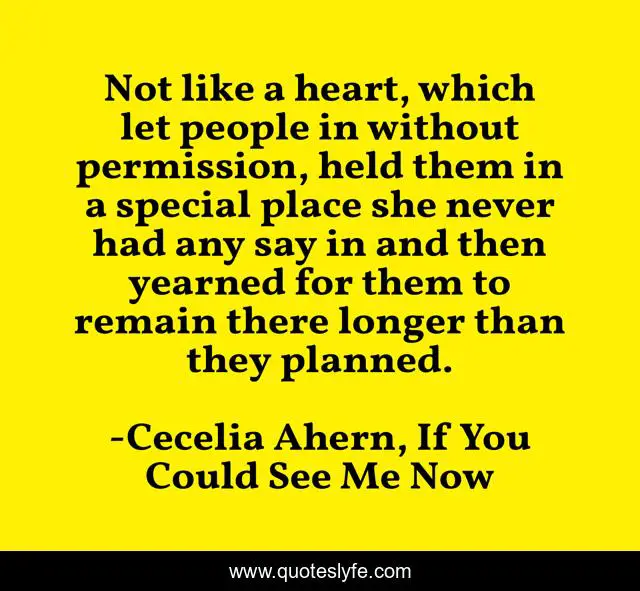 This page presents the quote "Not like a heart, which let people in without permission, held them in a special place she never had any say in and then yearned for them to remain there longer than they planned.". Author of this quote is Cecelia Ahern, If You Could See Me Now. This quote is about heartbreak, love, affection,.