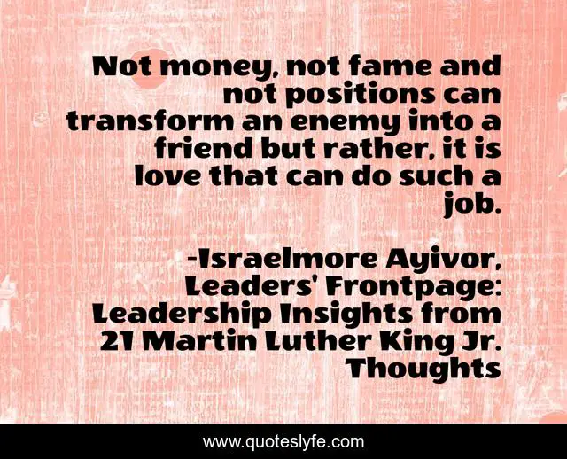 This page presents the quote "Not money, not fame and not positions can transform an enemy into a friend but rather, it is love that can do such a job.". Author of this quote is Israelmore Ayivor, Leaders' Frontpage: Leadership Insights from 21 Martin Luther King Jr. Thoughts. This quote is about enemy, food-for-thought, martin-luther, love, leaders, martin-luther-king-jr, money, israelmore-ayivor, transform,.