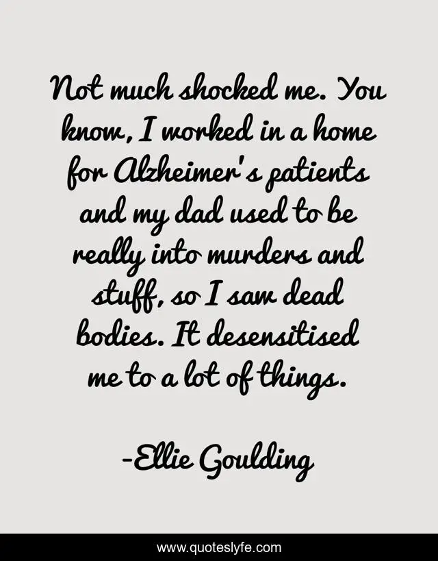 This page presents the quote "Not much shocked me. You know, I worked in a home for Alzheimer's patients and my dad used to be really into murders and stuff, so I saw dead bodies. It desensitised me to a lot of things.". Author of this quote is Ellie Goulding. .