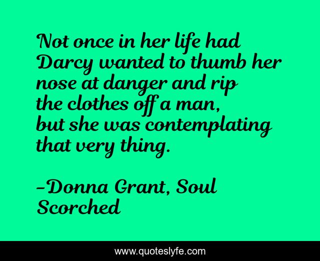 This page presents the quote "Not once in her life had Darcy wanted to thumb her nose at danger and rip the clothes off a man, but she was contemplating that very thing.". Author of this quote is Donna Grant, Soul Scorched. This quote is about dreagan, dragon-kings, dragons, druids, scottish-romance,.