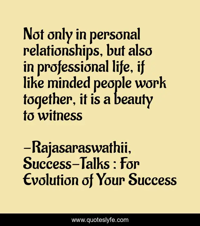 This page presents the quote "Not only in personal relationships, but also in professional life, if like minded people work together, it is a beauty to witness". Author of this quote is Rajasaraswathii, Success-Talks : For Evolution of Your Success. This quote is about love, relationship, administration, management-and-leadership, administration-block, professional-development, affection,.