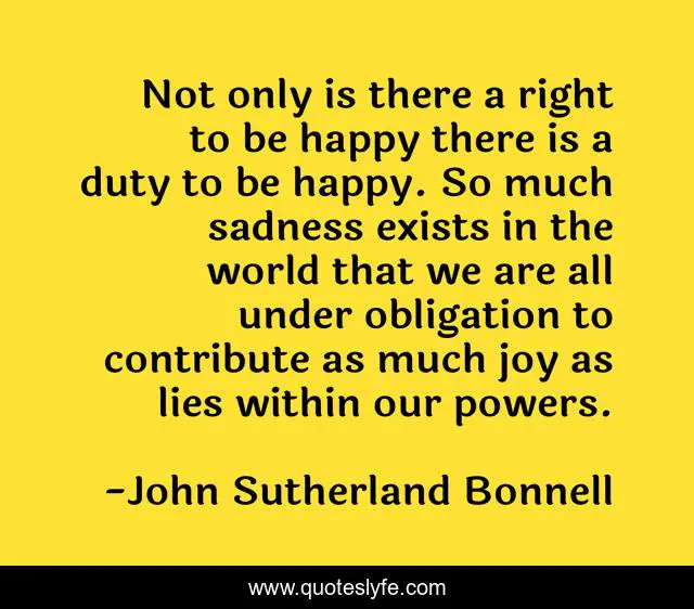 This page presents the quote "Not only is there a right to be happy there is a duty to be happy. So much sadness exists in the world that we are all under obligation to contribute as much joy as lies within our powers.". Author of this quote is John Sutherland Bonnell. .