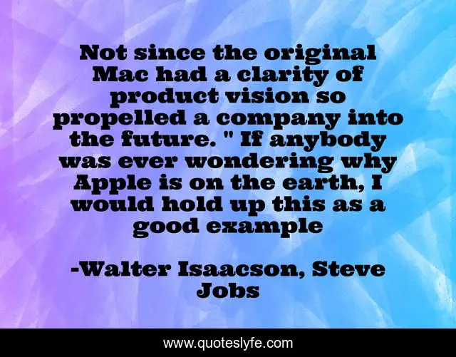 This page presents the quote "Not since the original Mac had a clarity of product vision so propelled a company into the future. " If anybody was ever wondering why Apple is on the earth, I would hold up this as a good example". Author of this quote is Walter Isaacson, Steve Jobs. This quote is about product, visionary, details,.