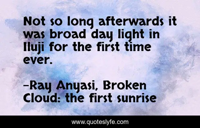 This page presents the quote "Not so long afterwards it was broad day light in Iluji for the first time ever.". Author of this quote is Ray Anyasi, Broken Cloud: the first sunrise. This quote is about light, mystic,.