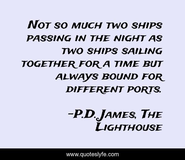 This page presents the quote "Not so much two ships passing in the night as two ships sailing together for a time but always bound for different ports.". Author of this quote is P.D. James, The Lighthouse. This quote is about romance, encounters,.