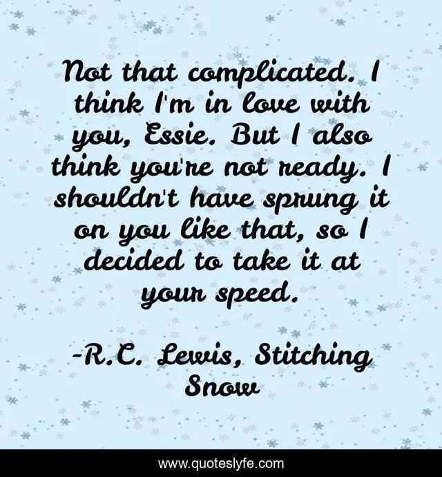 This page presents the quote "Not that complicated. I think I'm in love with you, Essie. But I also think you're not ready. I shouldn't have sprung it on you like that, so I decided to take it at your speed.". Author of this quote is R.C. Lewis, Stitching Snow. This quote is about waiting, love, affection,.