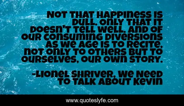 This page presents the quote "Not that happiness is dull. Only that it doesn't tell well. And of our consuming diversions as we age is to recite, not only to others but to ourselves, our own story.". Author of this quote is Lionel Shriver, We Need to Talk About Kevin. This quote is about story, happiness,.