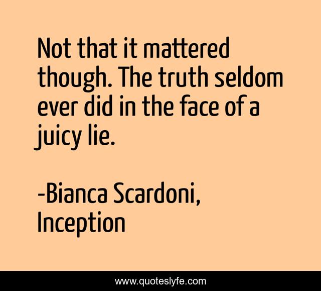 This page presents the quote "Not that it mattered though. The truth seldom ever did in the face of a juicy lie.". Author of this quote is Bianca Scardoni, Inception. This quote is about lie, rumors, truth, gossip, inception, the-marked,.