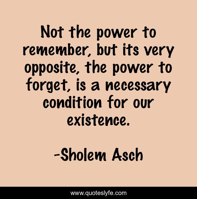This page presents the quote "Not the power to remember, but its very opposite, the power to forget, is a necessary condition for our existence.". Author of this quote is Sholem Asch. This quote is about remembering, existence, forgetting,.