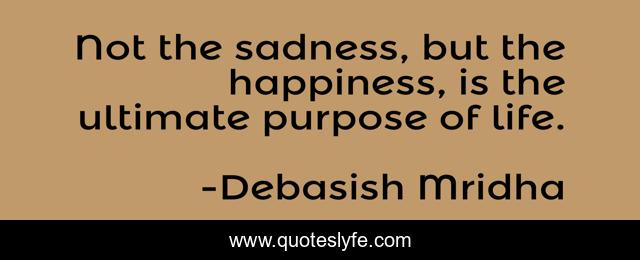 This page presents the quote "Not the sadness, but the happiness, is the ultimate purpose of life.". Author of this quote is Debasish Mridha. This quote is about life, love, knowledge, inspirational, intelligence, purpose, philosophy, wisdom, sadness,.