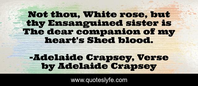 This page presents the quote "Not thou, White rose, but thy Ensanguined sister is The dear companion of my heart's Shed blood.". Author of this quote is Adelaide Crapsey, Verse by Adelaide Crapsey. This quote is about grief, rose,.