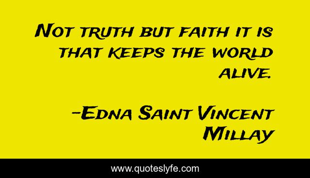 This page presents the quote "Not truth but faith it is that keeps the world alive.". Author of this quote is Edna Saint Vincent Millay. This quote is about faith, unity,.