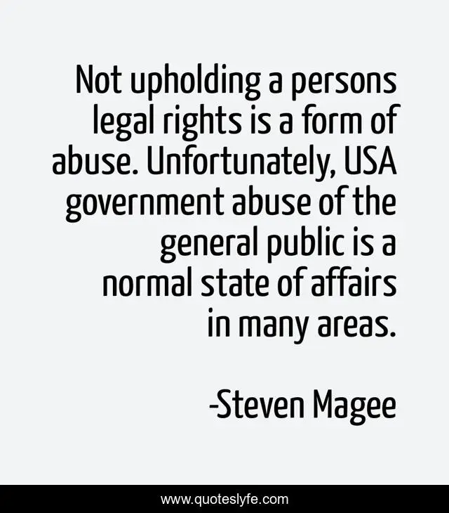 This page presents the quote "Not upholding a persons legal rights is a form of abuse. Unfortunately, USA government abuse of the general public is a normal state of affairs in many areas.". Author of this quote is Steven Magee. This quote is about affairs, usa, unfortunately, form, normal, government-cover-ups, rights, legal, general,.