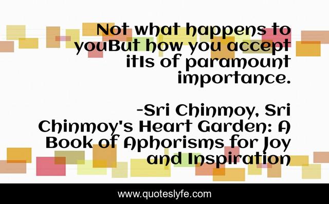 This page presents the quote "Not what happens to youBut how you accept itIs of paramount importance.". Author of this quote is Sri Chinmoy, Sri Chinmoy's Heart Garden: A Book of Aphorisms for Joy and Inspiration. This quote is about enthusiasm, inspirational, wisdom,.