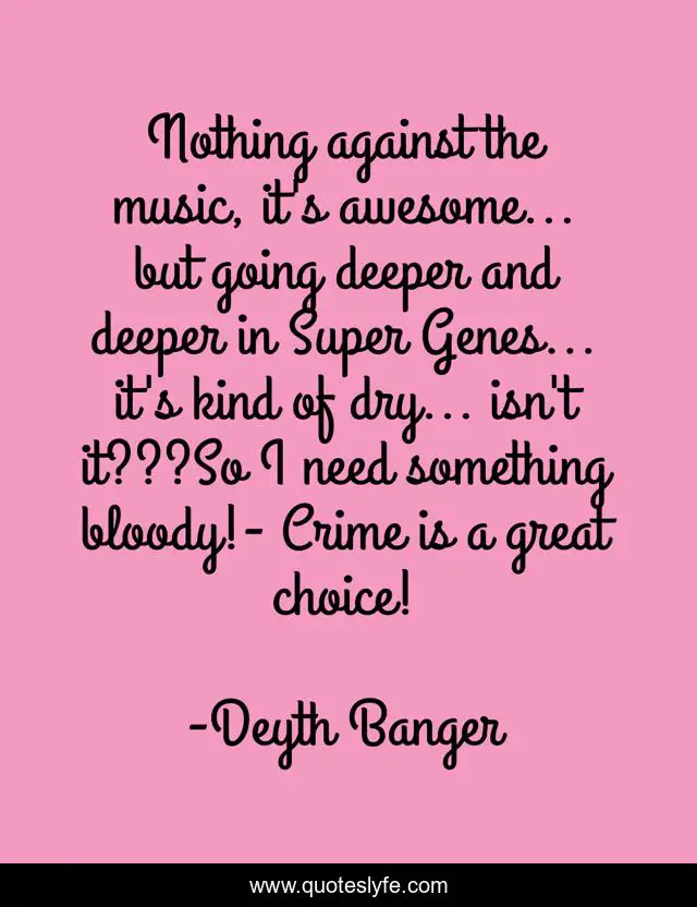 This page presents the quote "Nothing against the music, it's awesome... but going deeper and deeper in Super Genes... it's kind of dry... isn't it???So I need something bloody!- Crime is a great choice!". Author of this quote is Deyth Banger. This quote is about dry, great, choice, crime,.