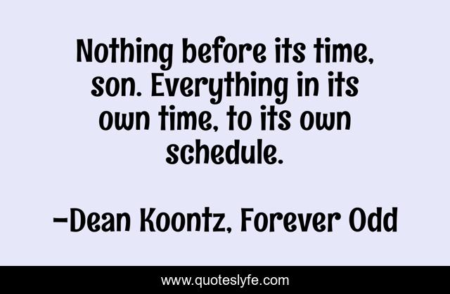 This page presents the quote "Nothing before its time, son. Everything in its own time, to its own schedule.". Author of this quote is Dean Koontz, Forever Odd. This quote is about destiny, fate, schedule, chief-wyatt-porter, time, odd-thomas,.