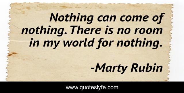 This page presents the quote "Nothing can come of nothing. There is no room in my world for nothing.". Author of this quote is Marty Rubin. This quote is about nothing, my-world, nothingness,.