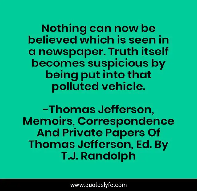 This page presents the quote "Nothing can now be believed which is seen in a newspaper. Truth itself becomes suspicious by being put into that polluted vehicle.". Author of this quote is Thomas Jefferson, Memoirs, Correspondence And Private Papers Of Thomas Jefferson, Ed. By T.J. Randolph. This quote is about media, newspapers, truth,.