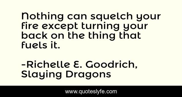This page presents the quote "Nothing can squelch your fire except turning your back on the thing that fuels it.". Author of this quote is Richelle E. Goodrich, Slaying Dragons. This quote is about life, richelle-e-goodrich, hope, drive, slaying-dragons, intention, richelle, goals, ambition,.