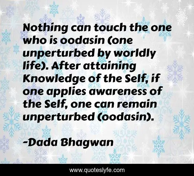 This page presents the quote "Nothing can touch the one who is oodasin (one unperturbed by worldly life). After attaining Knowledge of the Self, if one applies awareness of the Self, one can remain unperturbed (oodasin).". Author of this quote is Dada Bhagwan. This quote is about self-realization, life, spiritual, worldly, world,.