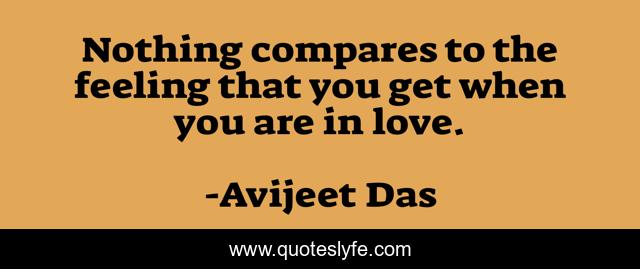 This page presents the quote "Nothing compares to the feeling that you get when you are in love.". Author of this quote is Avijeet Das. This quote is about life, love, feelings, feelings-of-love, love-is-all-you-need, meaning-of-love, affection, meaning-of-life-is-relationships,.