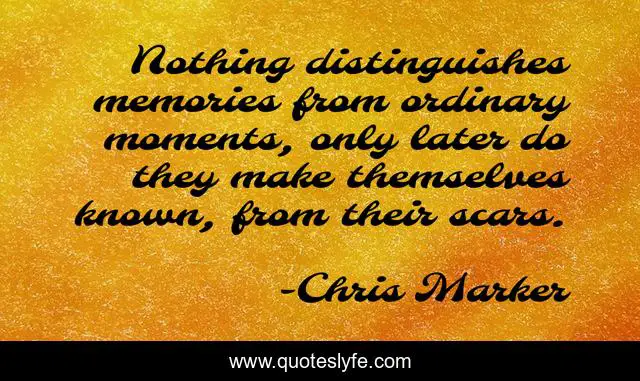 This page presents the quote "Nothing distinguishes memories from ordinary moments, only later do they make themselves known, from their scars.". Author of this quote is Chris Marker. .