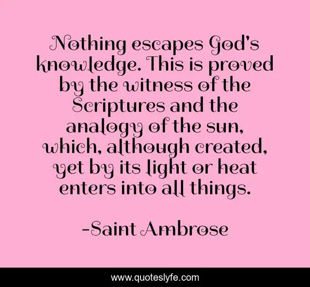 This page presents the quote "Nothing escapes God's knowledge. This is proved by the witness of the Scriptures and the analogy of the sun, which, although created, yet by its light or heat enters into all things.". Author of this quote is Saint Ambrose. This quote is about light, god, sun,.