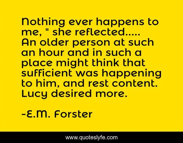 This page presents the quote "Nothing ever happens to me, " she reflected..... An older person at such an hour and in such a place might think that sufficient was happening to him, and rest content. Lucy desired more.". Author of this quote is E.M. Forster. This quote is about memories, reflections, youthfulness,.